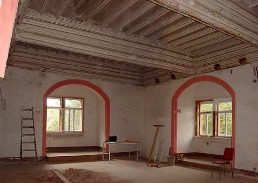 Im Laufe der bislang noch nicht abgeschlossenen Bauuntersuchungen wurden in den Obergeschossen reich profilierte Balkendecken freigelegt, die den ehemaligen Wohn- und Festräumen ein repräsentives Aussehen geben. Hier die Balkendecke der Hofestube. | ||||||||||||||||||||||||||||||||||||||||||||||||||||||||||||||||||||||||||||||||||||||||||||||||