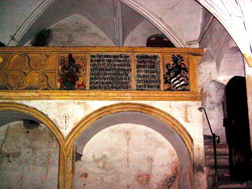 | In der Nordostecke des Erdgeschosses befindet sich die Schloßkapelle, hier berichtet eine Inschrift an der Emporenbrüstung, daß das Schloß der Ritter Caspar von Schönberg hat bauen lassen, das es 1488 vollendet wurde und sein Baumeister Hans Reynhart war. | ||||||||||||||||||||||||||||||||||||||||||||||||||||||||||||||||||||||||||||||||||||||||||||||||