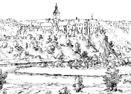 Schloß Sachsenburg, 1627 (Federzeichnung von Wilhelm Dillich) | ||||||||||||||||||||||||||||||||||||||||||||||||||||||||||||||||||||||||||||||||||||||||||||